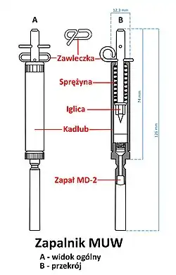 Zapalnik MUW składa się z mechanizmu uderzeniowego typu iglicowego i zapału MD-2 lub MD-5M. Jego mechanizm uderzeniowy posiada kadłub, iglicę i zawleczki w kształcie litery „T” (działania naciskowego[1]) lub „P” (działania naciągowego[1]). Działanie zapalnika następuje na skutek wyciągnięcia zawleczki bojowej; iglica pod działaniem sprężyny uderza w spłonkę zapalającą zapału, na skutek czego następuje jego odpalenie i wybuch miny[2].