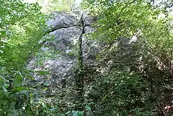 W odległości około 100 m na północny zachód, na skraju lasu, przy tym samym czerwonym szlaku turystycznym jest Skała z Krzyżem[1].