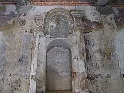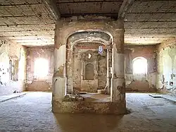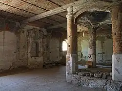 Główna sala modlitewna przykryta jest sklepieniem dziewięciopolowym, które na środku wspierają cztery, XVIII-wieczne, grube filary, połączone archiwoltami, między którymi pierwotnie stała bima. Na ścianie wschodniej zachował się murowany Aron ha-kodesz ujęty dwiema półkolumnami, który wieńczy malowidło przedstawiające słońce wśród chmur wraz z hebrajską inskrypcją: „Od wschodu słońca aż po zachód jego niech imię Haszem będzie pochwalone” (Ps 113,3)[5]. Całość ujęta została w iluzjonistyczne obramienie w postaci fioletowej kotary z pierwszej połowy XIX wieku. Podobną dekorację powtarzano w co najmniej dwu z czterech kolejnych przemalowań[5].