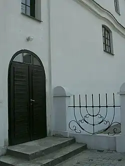 Na ścianie wschodniej zachowała się również wnęka po Aron ha-kodesz oraz drewniane obramowania wykonanych w ścianach szafek. We wnętrzu Aron ha-kodesz zachowała się nieeksponowana dziś belka z tekstem: „Pamięci duszy Pani Mendli Racheli od jej męża Chaima Szlomy syna Isera ha-Lewiego”. Całe wnętrze jest oświetlone wysokimi, półokrągle zakończonymi oknami.