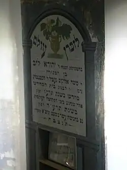 Na ścianie południowej znajduje się inskrypcja fundacyjna o treści: „Na wieczną pamiątkę trudów zmarłego pana Jehudy Lejba, syna zmarłego pana Mosze Elijahima Gecela, błogosławionej pamięci Lichtenberga; jego ofiarności za wybudowanie domu studiów od nowa w roku 676 po zniszczeniach wojny światowej w roku 675. Zmarł 15 szwat 691 w Siedlcach”.