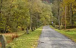 Droga w całości położona jest w Parku Narodowym Gór Stołowych, po północno-wschodniej stronie Błędnych Skał i prowadzi od drogi wojewódzkiej nr 389 w Karłowie do byłego przejścia granicznego na szlaku turystycznym Ostra Góra-Machovská Lhota z Czechami[2]. Droga prowadzi lasem regla dolnego, trawersując serpentynami północne zbocze wierzchowiny Skalniaka i zachodnie zbocze Ostrej Góry[2]. Droga na całej długości pokonuje różnicę wzniesień około 250 m.[2]