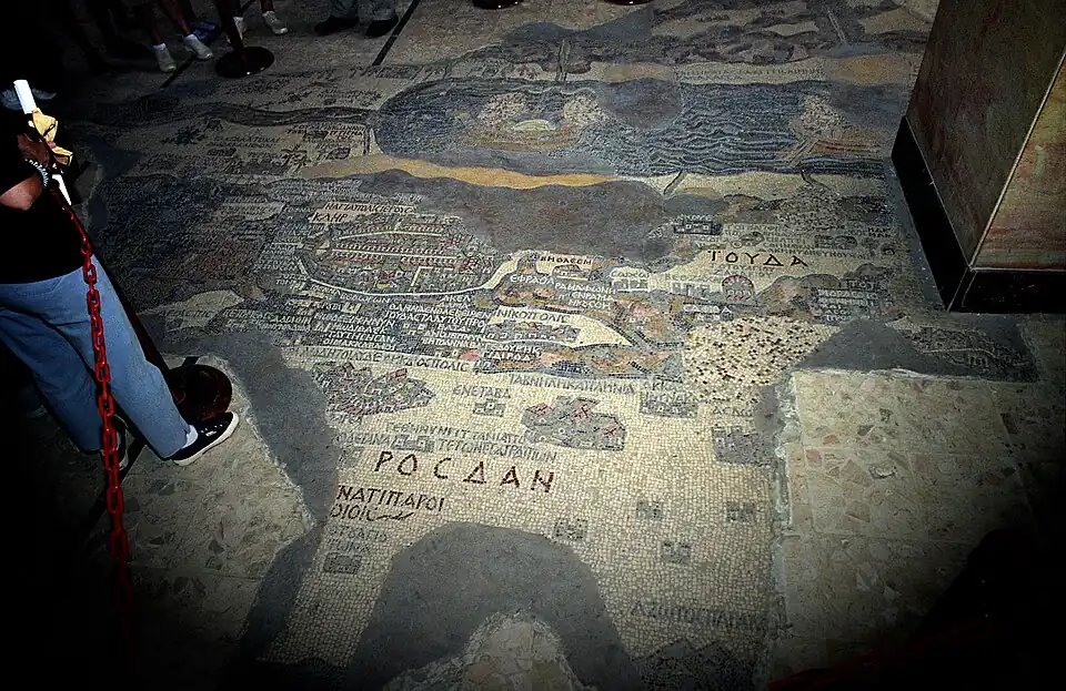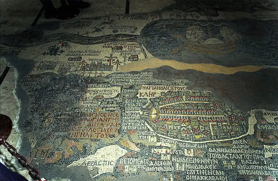 - mapa mozaikowa z Madaby - mozaikowa mapa Palestyny i Dolnego Egiptu pochodząca z VI wieku na posadzce prawosławnej bazyliki św. Jerzego. Pierwotny rozmiar mapy jest szacowany na 6 metrów szerokości i 15[1] lub 16[2] lub nawet 25[1] metrów długości.Zachowany fragment mapy obejmuje obszar od Libanu na północy do delty Nilu na południu. Wewnątrz kościoła znajdują się również ikony przedstawiające m.in. św. Jerzego zabijającego smoka.