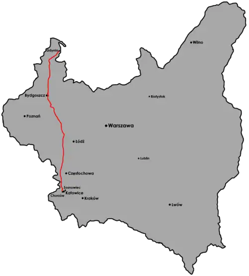 - o długości 567 km przez Lubliniec, „korytarz kluczborski” (należący do Niemiec), Ostrów Wielkopolski, Jarocin, Gniezno, Inowrocław, Bydgoszcz, Tczew, Gdańsk; transport na tej trasie utrudniały opłaty i przeszkody stawiane przez stronę niemiecką[2].