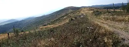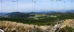 - część wschodnia – od Przełęczy Magurskiej po dolinę Popradu. Z Przełęczy Magurskiej grzbiet biegnie dalej w kierunku północno-wschodnim, obniżając się poprzez Jawor (ok. 970 m) do Przełęczy Toporzeckiej (802 m). Od przełęczy grzbiet znów wznosi się poprzez Kamieniarkę (935 m), Riniavę (1005 m) i Plontanę (1040 m) na Wietrzny Wierch (1111 m)[4]. Na nim pasmo rozgałęzia się na kilka krótkich grzbietów opadających do miejscowości Wyżne Rużbachy, do Kamionki i do Przełęczy Stráňanské sedlo[5].