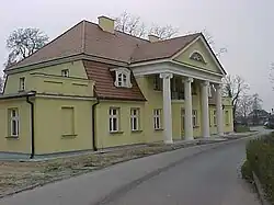 Dwór – wzniesiony przez Lipskich w końcu XVIII w. Częściowo przebudowany przez Gutowskich w I poł. XIX w. i powiększony o parterowe skrzydła boczne wraz ze zmianą lokalizacji schodów wewnętrznych na poddasze. Na początku XX w. rozbudowany o portyk frontowy. W okresie PRL zaniedbany, doprowadzony do całkowitej ruiny. W 1999 r. gruntowanie remontowany i adaptowany na siedzibę Służb Ochrony Zabytków[5].