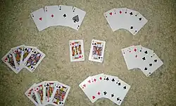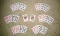 Dwóch lub więcej graczy otrzymuje po 5 kart; następnie górna karta z talii jest umieszczana na stole. Gra zaczyna się od lewej strony krupiera.