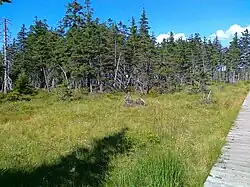 , z umieszczonym na nim deskowym chodnikiem[17] (z uwagi na podmokły obszar torfowiskowy[18]) oraz zlokalizowanym na nim przystanku turystycznym o nazwie Malý Jezerník, z podaną na tablicy informacyjnej wysokością 1200 m[8]. Szczyt góry zlokalizowany jest kilka metrów od czerwonego szlaku turystycznego