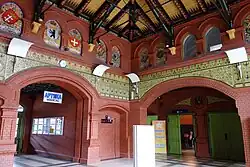 Dworzec jest budynkiem wielobryłowym, piętrowym z poddaszem. Wykonany jest z cegły pełnej, natomiast elewacja jest wykonana z licówki, nietynkowana. Portal od strony placu jest wykonany z piaskowca. Wnętrza są częściowo otynkowane, a częściowo wyłożone boazerią. Podłogi są wykonane z ceramiki. W oknach poczekalni znajdują się witraże przedstawiające herby okolicznych miast. Stropy są drewniane, w poczekalni rzeźbione[7].