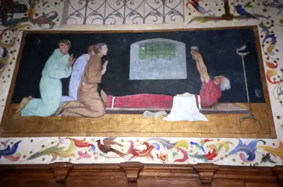 - ↑ Można przypuszczać, że na tle tak skomponowanej dekoracji zasiadali celebrujący nabożeństwa duchowni oraz ich asysta.