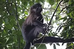 Lophocebus aterrimus | (Oudemans, 1890) | mangabka czarna | gatunek monotypowy | Demokratyczna Republika Konga, w centralnej części Kotliny Konga, na południe i zachód od zbiegu rzek Kongo-Lualaba | DC: 40–62 cm DO: 55–85 cm MC: 4,5–8 kg |