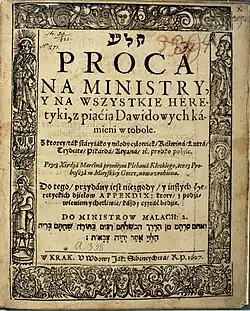 - (Kraków, 1607) Proca na ministry y na wszystkie beretyki, z piącią Dawidowych kamieni w tobole. Z ktorey, tak stary iako y młody człowiek, Kalwina, Lutra, Trydeitę, Pikarda, Aryana etc. prędko poźyie. Przez Xiędza Marcina przed tym Plebana Kłeckiego, teraz Proboszcza w Mieyskiey Gorce, nowo urobiona. Do tego przydany iest niezgodny, y inszych Heretyckich dzielow Appendix: który z podziwieniem y chętliwie, każdy czytać będzie, w Krak. u Wdowy Jak. Sibeneychera, R. P. 1607;