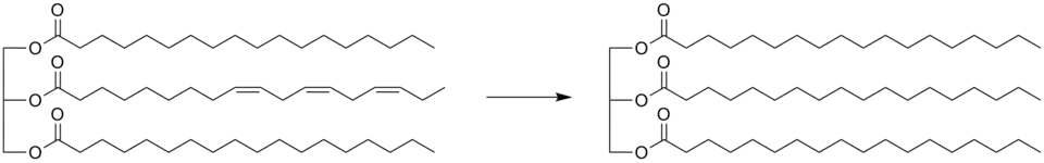 Produkcja margaryny z ciekłych tłuszczów roślinnych została wprowadzona po odkryciu przez Wilhelma Normanna metody ich utwardzania przez uwodornienie (patent GB 1515, 1903). Obecnie najczęściej stosowanym katalizatorem tej reakcji jest nikiel[1].