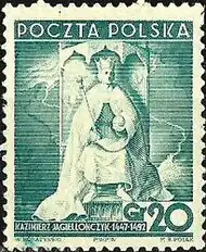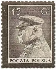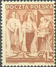 - Jagiełło i Jadwiga, 15 gr (znaczek z tzw. serii historycznej w wersji bez mieczy, wprowadzony po protestach III Rzeszy) – 1939