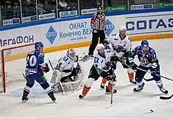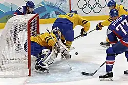 ![]() Martin Štrbák (z lewej) w barwach Słowacji podczas MŚ 2008. Z prawej Fin Antti Pihlström. | |