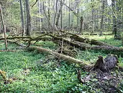 W Puszczy Białowieskiej charakteryzującej się wyjątkowo wysokim stopniem naturalności na jednym hektarze lasu jest 120 m³/ha leżącego martwego drewna, a wraz ze stojącymi martwymi drzewami i fragmentami pni 130–140 m³[1][19][22].