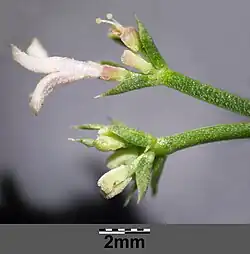 - Drobne, zebrane w widlasto rozgałęzione wierzchotki. Są różowawe lub białe, zwykle 3-krotne. Korona ma długość 3–9 mm, a jej rurka jest mniej więcej tak samo długa, jak płatki, lub nieco tylko dłuższa. Z zewnątrz często pokryta krótkimi szczecinkami[7].