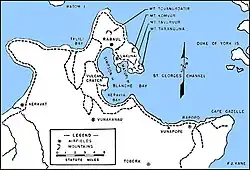 - ↑ 2. Pułk Specjalnych Sił Desantowych podlegał Cesarskiej Marynarce Wojennej. Jednostkę tę określa się niekiedy, niezbyt ściśle, mianem japońskiej piechoty morskiej (patrz: Gamble 2014 ↓, s. 65). Oddziały inwazyjne wydzielone ze składu 55 Dywizji Piechoty były natomiast jednostkami Cesarskiej Armii Japońskiej. Całościowe dowodzenie operacją zdobycia Nowej Brytanii spoczywało w ręku marynarki wojennej (patrz: Felton 2009 ↓, s. 29, 32).