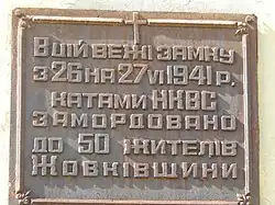 - ↑ W niemieckich meldunkach wojskowych liczbę zamordowanych oszacowano na około 50–60 osób. Z pewnością jest to jednak liczba znacznie zawyżona. Ponadto podano w nich niezgodnie z prawdą, że wszystkie ofiary były narodowości ukraińskiej. Patrz: Popiński, Kokurin i Gurjanow 1995 ↓, s. 13.