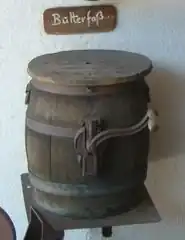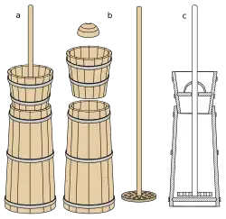 - w postaci nieruchomej beczki drewnianej z umieszczonym w niej mieszadłem, napędzanym korbą. Tutaj też można wyróżnić dwie konstrukcje: