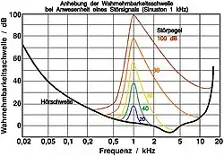 - maskowanie czasowe (lub nierównoczesne) – po usłyszeniu głośnego dźwięku przez pewien czas ucho jest niewrażliwe na cichsze tony[1][3]. Co istotne, zjawisko występuje również wstecznie, to znaczy przez krótki czas przed maskerem (tzw. premaskowanie)[1][2].