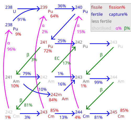 - ameryk-241 → kiur-242 → kiur-243 (bardziej prawdopodobnie, kiur-242 rozpada się na pluton-238, który również wymaga pochłonięcia dodatkowego neutronu aby stać się nuklidem rozszczepialnym).