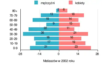 Współczesna struktura demograficzna wioski Matiaszów na podstawie danych z lat 1995–2009 według roczników GUS-u, z prezentacją danych z 2002 roku[13]: