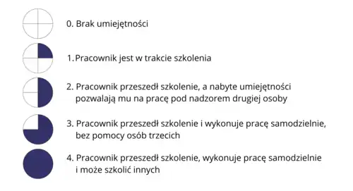 - 1 – Początkujący: Pracownik rozpoczyna naukę umiejętności, wymaga wsparcia i stałego nadzoru.