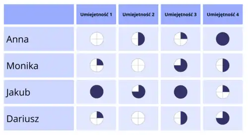 Innym przykładem skali ocen jest skala graficzna w postaci „ćwiartek”, która odwzoruje poziom umiejętności pracownika.