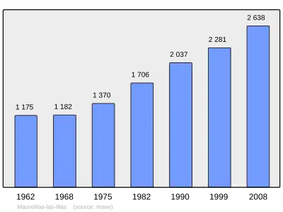 Według danych na rok 1990 gminę zamieszkiwało 2037 osób, a gęstość zaludnienia wynosiła 48 osób/km² (wśród 1545 gmin Langwedocji-Roussillon Maureillas-las-Illas plasuje się na 193. miejscu pod względem liczby ludności, natomiast pod względem powierzchni na miejscu 87.).