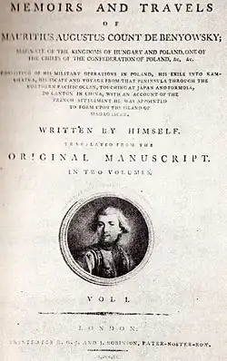 Historya podroży y osobliwszych zdarzen sławnego Maurycego-Augusta hrabi Beniowskiego, szlachcica polskiego y węgierskiego: zawieraiąca w sobie jego czyny woienne w Polszcze, w czasie konfederacyi barskiey, wygnanie iego nayprzód do Kazanu, potym do Kamszatki, waleczne iego z tey niewoli oswobodzenie się, żeglugę iego przez Ocean Spokoyny do Japonii, Formozy, Kantonu w Chinach, założenie nareszcie przez niego osady na wyspie Madagaskar ze zlecenia francuzkiego rządu, iego na tey wyspie woienne wyprawy, ogłoszenie go nareszcie najwyższym Madagaskaru rządcą z francuzkiego tłomaczona[26][27]