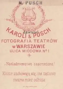 - 1 2 Leksykon fotografów warszawskich 1845-1945: PUSCH Maurycy [online], Leksykon fotografów warszawskich 1845-1945 [dostęp 2018-02-09] [zarchiwizowane z adresu 2018-02-09].