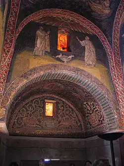 We wnętrzu kopuła zdobiona jest niebieską mozaiką ze złotym krzyżem, gwiazdami oraz symbolami ewangelistów. Na ścianach znajdujących się poniżej przedstawionych jest ośmiu apostołów oraz pijące gołębie. Woda, z której piją ptaki, to woda życia, odnosząca się do życia wiecznego (Kto zaś będzie pił wodę, którą Ja mu dam, nie będzie pragnął na wieki, lecz woda, którą Ja mu dam, stanie się w nim źródłem wody wytryskającej ku życiu wiecznemu J 4,14). Jeszcze niżej, w lunetach pod łukami, znajduje się wizerunek Dobrego Pasterza (nad drzwiami) oraz świętego Wawrzyńca (naprzeciw). Wawrzyniec niesie krzyż i zbliża się do rozżarzonego rusztu, na którym poniósł męczeńską śmierć. Z lewej strony stoi biblioteczka świętego z księgami czterech Ewangelii, które powinny wystarczyć gorliwemu wyznawcy Chrystusa za całą literaturę[3].