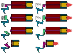- kurkowe – sprężyna uderzeniowa działa na iglicę za pośrednictwem elementu poruszającego się ruchem obrotowym (kurka)