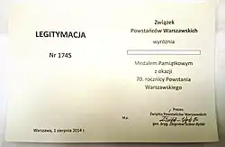 Dowodem nadania medalu żyjącym uczestnikom powstania jest legitymacja, wręczana wraz z odznaczeniem, podpisana przez prezesa zarządu głównego Związku Powstańców Warszawskich gen. Zbigniewa Ścibora-Rylskiego.