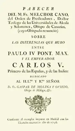 - ↑ Parecer del Maestro fr. Melchor Cano dado al Señor Emperador Carlos V. Madrid: 1736. Cervantes Virtual. Consultado el 10/07/2013.