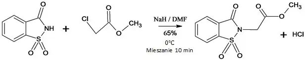 - Alkilowanie sacharyny chlorooctanem metylu w dimetyloformamidzie wobec wodorku sodu: