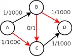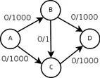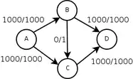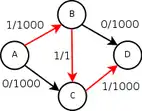 Warto zwrócić uwagę, w jaki sposób przepływ „wraca” z wierzchołka C do B po wykorzystaniu ścieżki A,C,B,D.