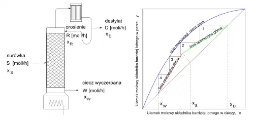 - linie pionowe, określające ułamek molowy B w surówce, destylacie i cieczy wyczerpanej