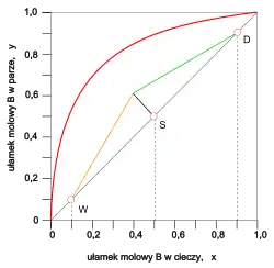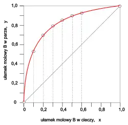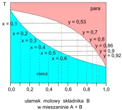 - linię równowagi – zależność ułamka molowego B w parze od ułamka molowego B w cieczy