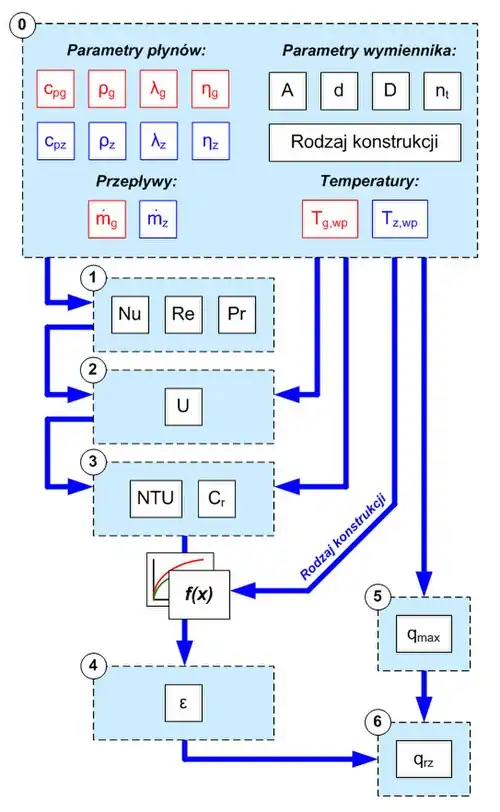 Punktem wyjściowym do obliczeń są parametry płynów, wartości natężenia ich przepływów oraz parametry wymiennika. Opierając się na nich oblicza się liczby Nusselta (Nu), Prandtla (Pr) oraz Reynoldsa (Re), które pozwalają na wyznaczenie współczynnika przenikania ciepła (U). Następnym krokiem jest określenie wyższego i niższego strumienia pojemności cieplnej. Gdy już oba strumienie zostaną określone, możliwe jest wyznaczenie stosunku strumieni pojemności cieplnej oraz liczby jednostek przenoszenia ciepła NTU. Znając te dwie wartości możliwe jest wyznaczenie wydajności która jest ich funkcją. Znając maksymalny przepływ ciepła oraz współczynnik wydajności oblicza się rzeczywisty przepływ ciepła