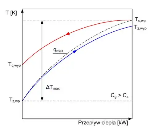 gdzie oznacza największy możliwy spadek lub wzrost temperatury na wymienniku (patrz wykresy obok):