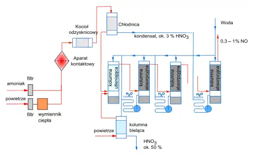 Po przejściu przez ogrzaną siatkę gazy są wyprowadzane z aparatu przez kołpak ze stali chromowej (20% Ni, 22% Cr) do wymiennika ciepła, w którym ciepło jest odzyskiwane w postaci pary technologicznej, a następnie do chłodnicy, w której kondensuje się para wodna, powstająca w reakcji na kontakcie. Kondensat zawiera ok. 3% kwasu azotowego (jest kierowany do ostatnich wież absorpcyjnych)[2]. Pozbawione wilgoci powietrza z tlenkiem azotu przepływa następnie przez kolumnę utleniającą oraz przez system wież absorpcyjnych (7–9 wież[3]), gdzie kontaktuje się z rozcieńczonym kwasem, płynącym w przeciwnym kierunku (przeciwprąd; gaz o najmniejszej zawartości tlenków azotu kontaktuje się z wodą, wprowadzaną do ostatniej wieży szeregu). Wieże, wykonane ze stali chromowo-niklowej, są wypełnione pierścieniami Raschiga[2] (specjalne konstrukcje wież projektował Ignacy Mościcki[3]). Każda z wież jest wyposażona w pompę cyrkulacyjną i chłodnicę (odbieranie ciepła reakcji utleniania i absorpcji, zachodzących w wieżach)[2].