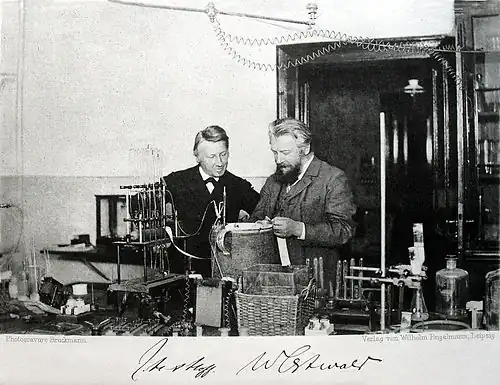 3). Masowe zastosowanie amoniaku stało się możliwe dzięki opanowaniu jego ciśnieniowej syntezy z azotu i wodoru, metodą opracowaną przez dwóch innych laureatów Nagrody Nobla w dziedzinie chemii – Fritza Habera (1918) i Carla Boscha (1931). Badania Ostwalda, dotyczące termodynamiki i kinetyki, były związane z równocześnie prowadzonymi pracami Jacobusa van ’t Hoffa – twórcy izotermy van ’t Hoffa i reguły van ’t Hoffa, pierwszego laureata Nagrody Nobla w dziedzinie chemii (1901)[4][5][6].