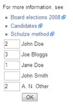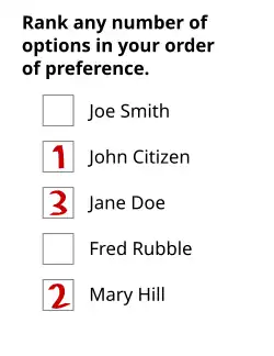 Głosowanie odbywa się przez wpisanie liczby przy każdym kandydacie. Wyborca oddaje głos, oznaczając wybranych kandydatów numerami: zaznaczając '1' obok najbardziej preferowanego kandydata, '2' obok następnego w kolejności preferencji itd.