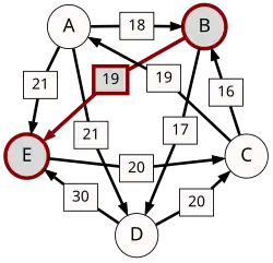 Kandydat E jest potencjalnym wygrywającym, ponieważ p[E,X] ≥ p[X,E] dla każdego innego kandydata X.