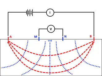 Do pomiaru w metodach elektrooporowych wykorzystuje się zestawy składające się z elektrod prądowych i potencjałowych. Przez elektrody prądowe (A,B) przepływa prąd generowany w urządzeniu sterującym zaś na elektrodach potencjałowych (M,N) mierzone jest napięcie. Znajomość odległości między nimi pozwala uzyskać wartość oporności w danym punkcie, która jest podstawą do dalszej interpretacji geologicznej. Zwiększanie odległości między elektrodami powoduje, że pole elektryczne rozchodzi się w większej jego części, a zatem też na większych głębokościach. Pozwala to uzyskać informacje o wgłębnej budowie ośrodka geologicznego[3].