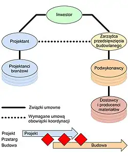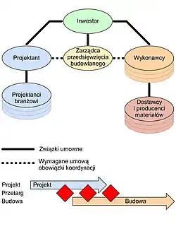 Gdy inwestor jest podmiotem administracji publicznej, to zawarta przez niego umowa z jednym podmiotem na realizację przedsięwzięcia budowlanego obejmująca zwykle prócz projektowania i budowy dodatkowe usługi, jak wymienione powyżej, jest znana jako Partnerstwo publiczno-prywatne (P3)[1].