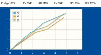- PV (planned value, albo BCWS – Budgeted Cost of Work Scheduled) – informuje o tym, jaka powinna być wartość zakresu dostarczonego od początku projektu do dnia kontroli.