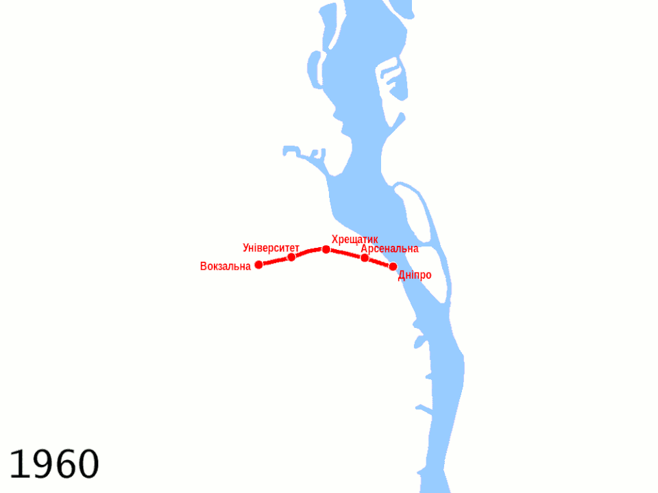 W 1965 roku wybudowano most przez Dniepr, który połączył lewobrzeżną dzielnicę Darnycja z centrum miasta. Linię tę rozbudowano w 1971 roku doprowadzając ją do dzielnicy Swiatoszyn. Linia ta otrzymała kolor czerwony. Drugą linię otwartą w 1976; otrzymała kolor niebieski i zwana była Kureniwśko-Czerwonoarmijśką (Куренівсько-Червоноармійська). Łączyła ona północne i południowe prawobrzeżne dzielnice z centrum miasta. W 1980 roku nastąpiła jej rozbudowa do dzielnicy Obołoń. Trzecią linię, zieloną, czyli Syrećko-Peczerśka (Сирецько-Печерська) otworzono w 1989 roku. W roku 1990 po wybudowaniu nowego mostu nad Dnieprem przedłużono ją do dzielnicy Charkiwśkyj Masyw. 23 maja 2008 roku została otwarta stacja Czerwonyj chutir.